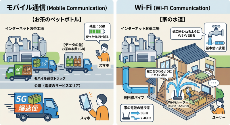 ※Wi-Fiがない場所でも、スマホだけでインターネットができる仕組みのことです。 お茶で例えるなら、家の水道(Wi-Fi)を使うのではなく、外で「ペットボトルのお茶」を買って飲むようなもの。使った分だけ「ギガ」という中身が減っていきます。