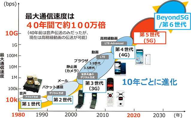 下図は総務省からの抜粋です。アナログ方式の第1世代、デジタル方式 ピッチ・ガラケーの第2世代、スマホでインターネットの世界が展開した第3世代、動画が快適になった第4世代、そして今は快適スマホ 第5世代。 5Gの「G」は Generation(世代) の頭文字です。もうすぐそこに第6世代の波が押し寄せているんだね。